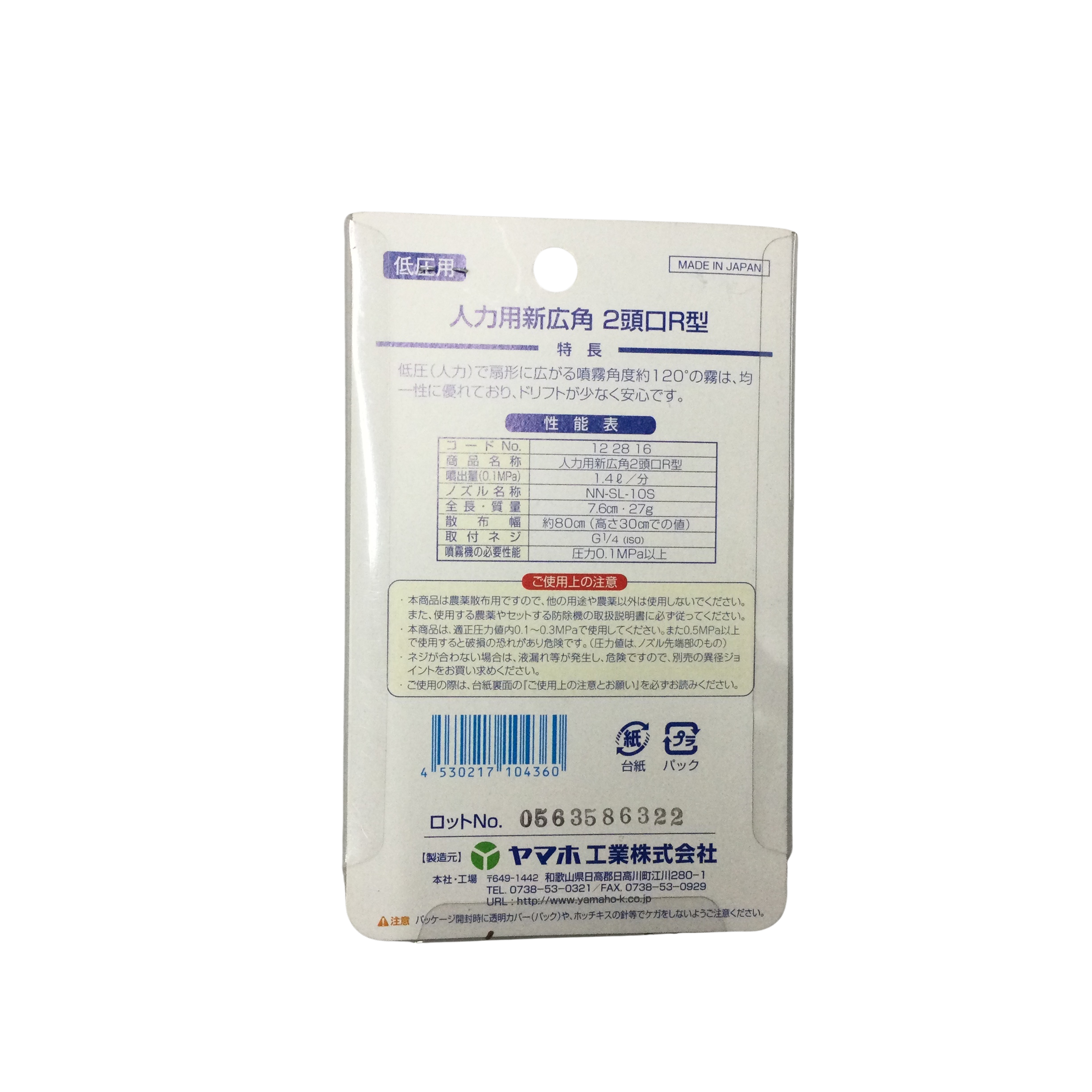 ● 低圧(人力)で広がる扇形の噴霧角度約120°の霧は、均一性に優れており、ドリフトが少なく安心です。